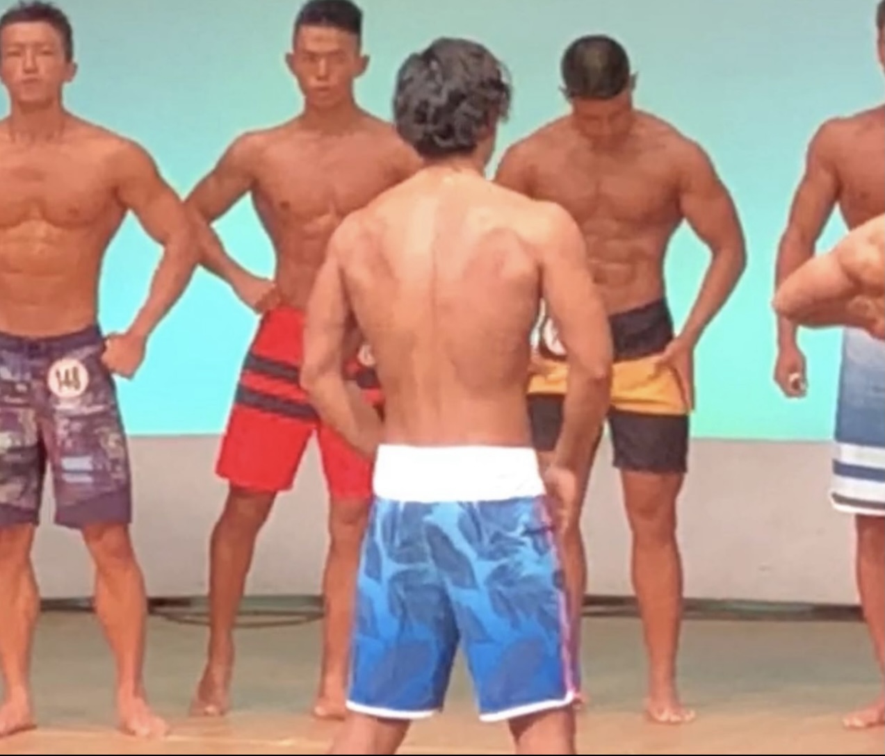 水を抜きすぎて脚が震えるのか、痙攣しながらポーズをする選手。